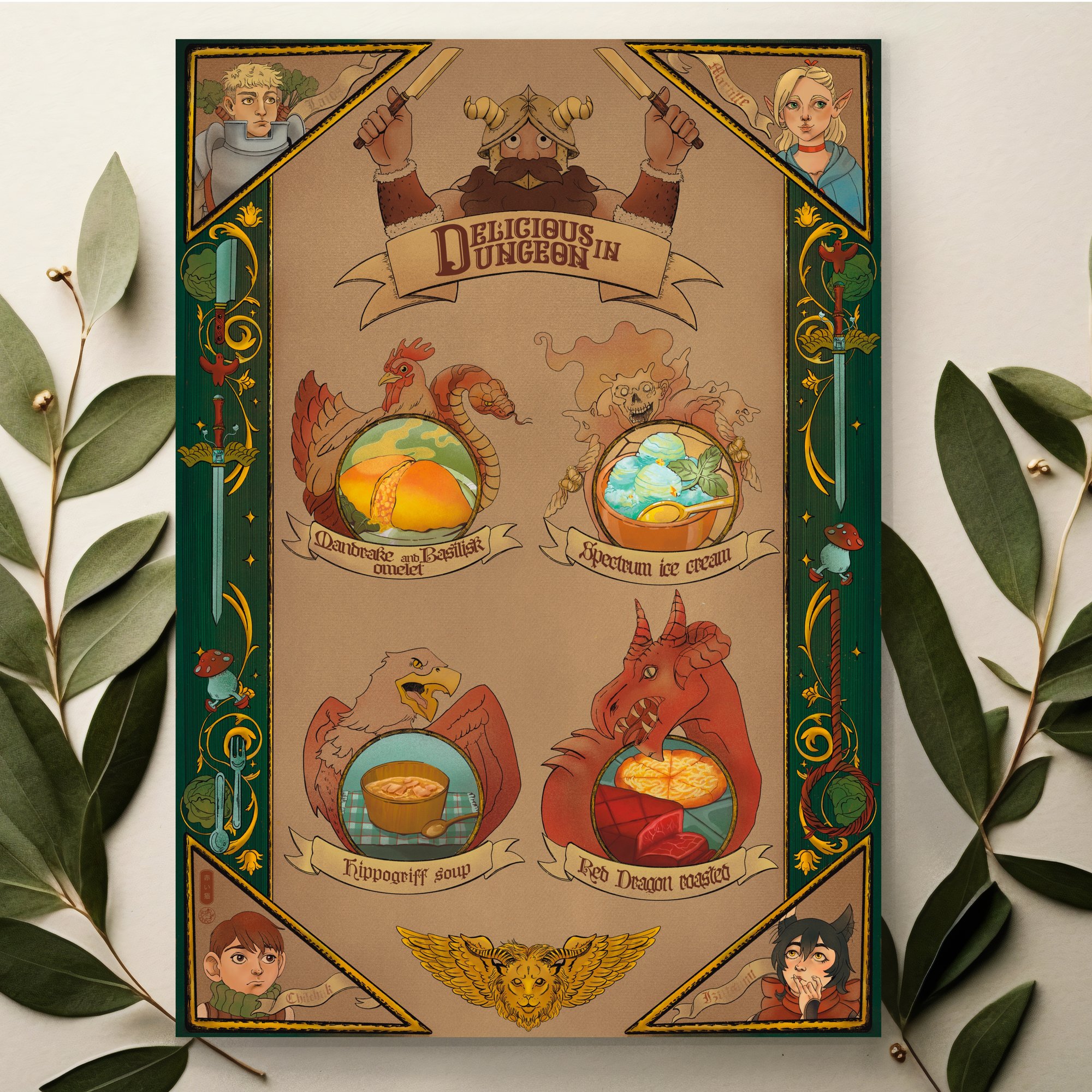 Ilustración inspirada en Delicious in Dungeons, impresa en papel de 300 gramos con efecto relieve.