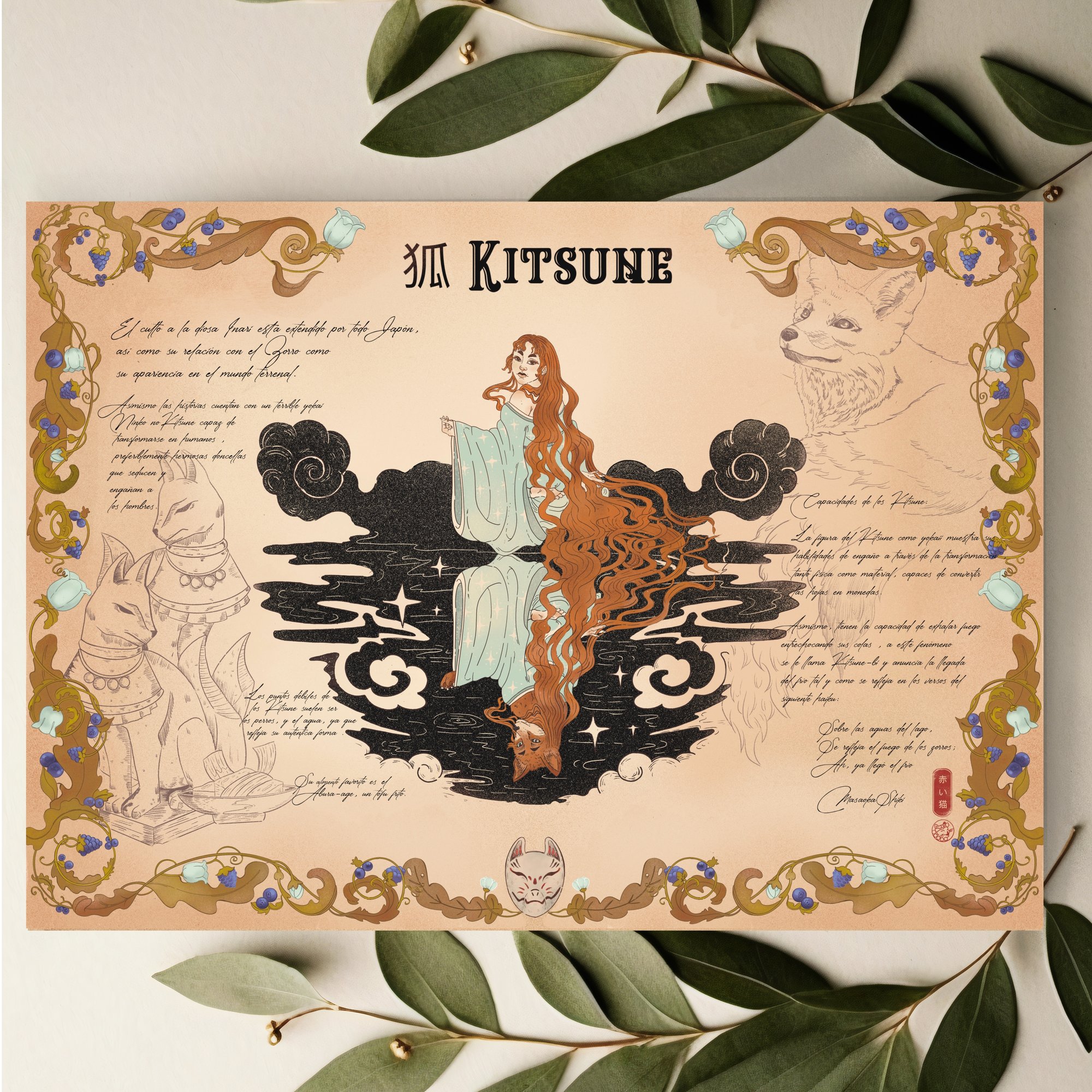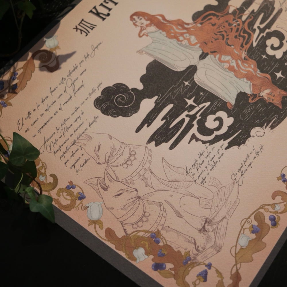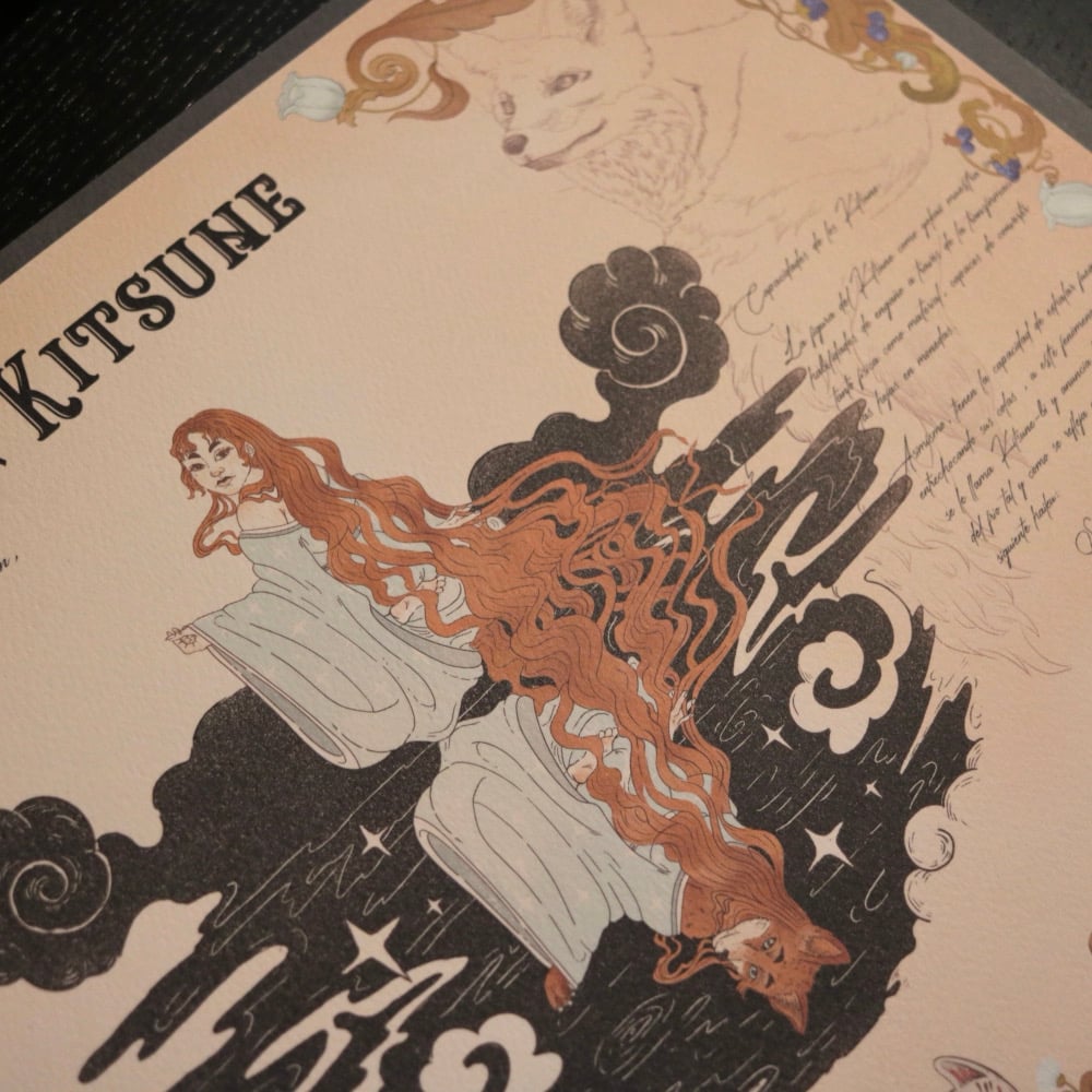 Ilustración inspirada en el mito del Kitsune, impresa en papel de 300 gramos con efecto relieve.