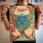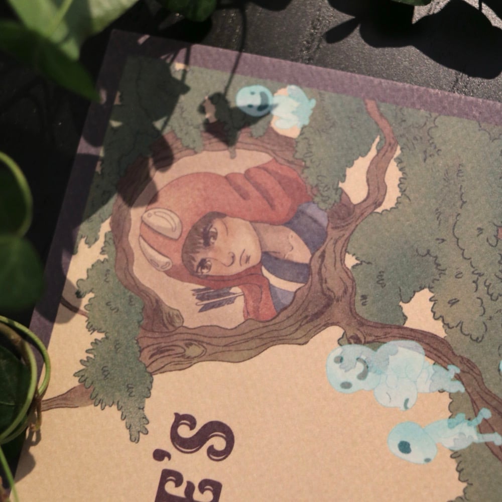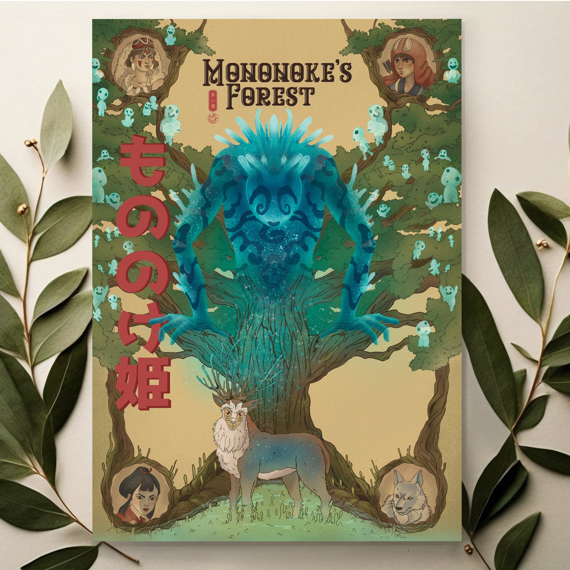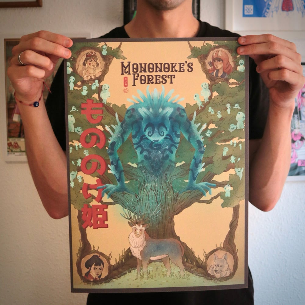 Ilustración inspirada en el bosque de la princesa Mononoke, impresa en papel de 300 gramos con efecto relieve.