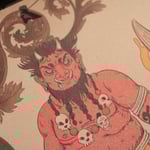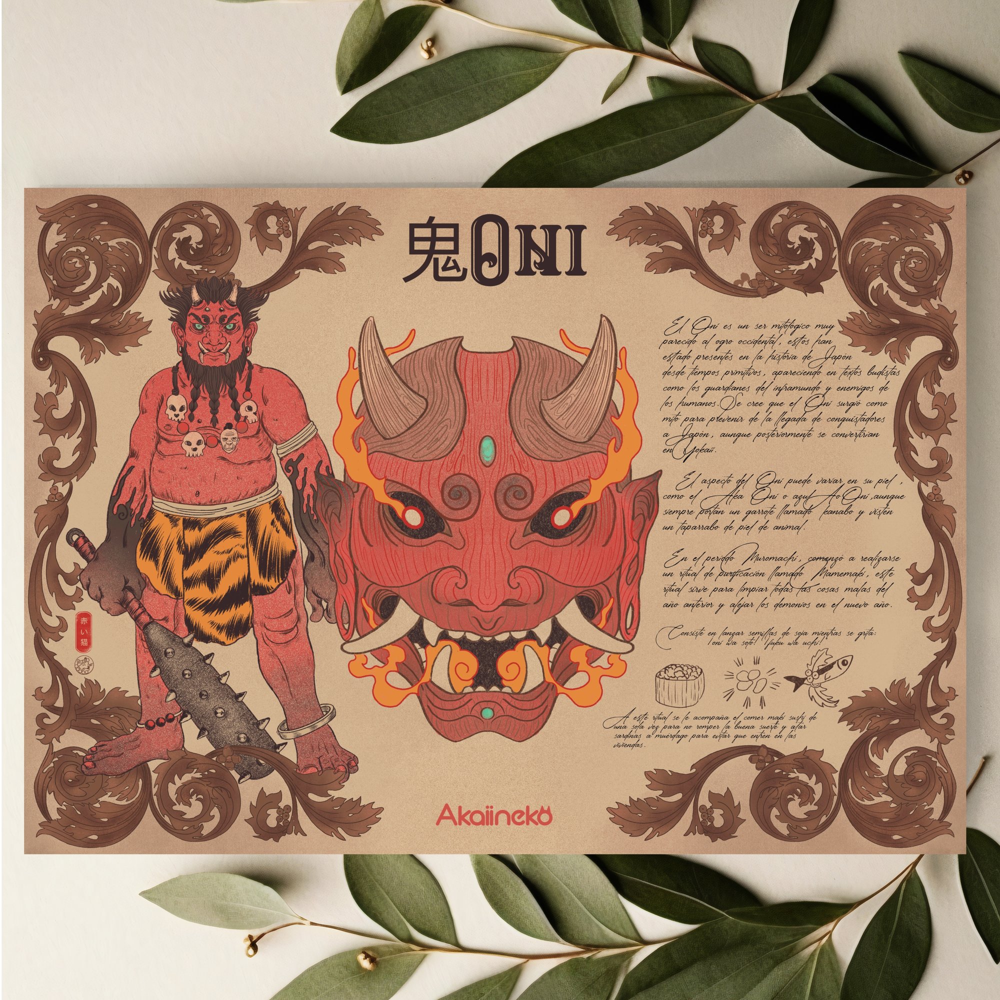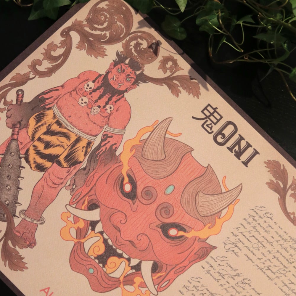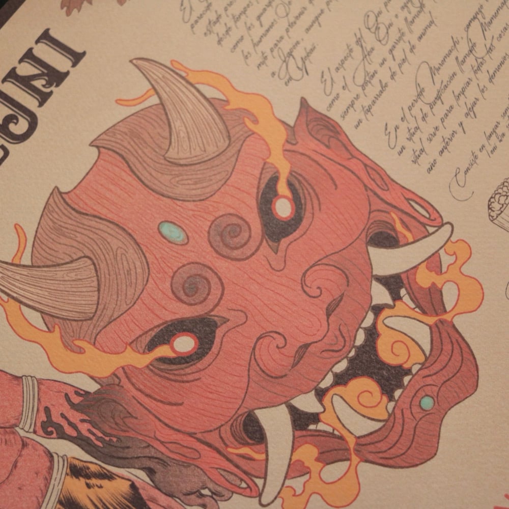 Ilustración inspirada en el mito del Oni, impresa en papel de 300 gramos con efecto relieve.