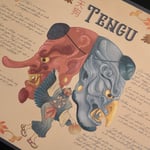 Ilustración inspirada en el mito del Tengu, impresa en papel de 300 gramos con efecto relieve.